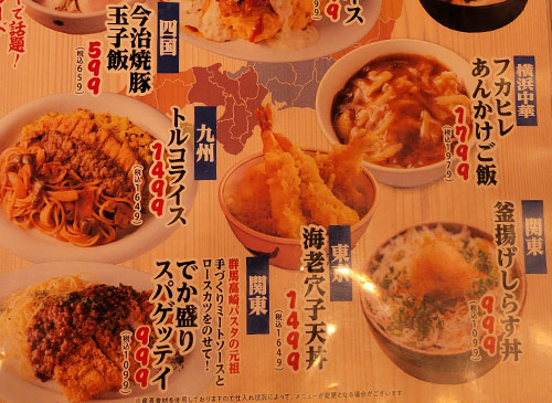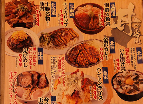 トルコライス、ハントンライス、えびめしなど『ケンミンショー』や『せっかくグルメ』で見かけた全国のご当地グルメが楽しめる。 メインは海鮮料理だが、その他にも串焼き、うどん、そば、ラーメン丼ものとバカみたいにメニューが豊富。